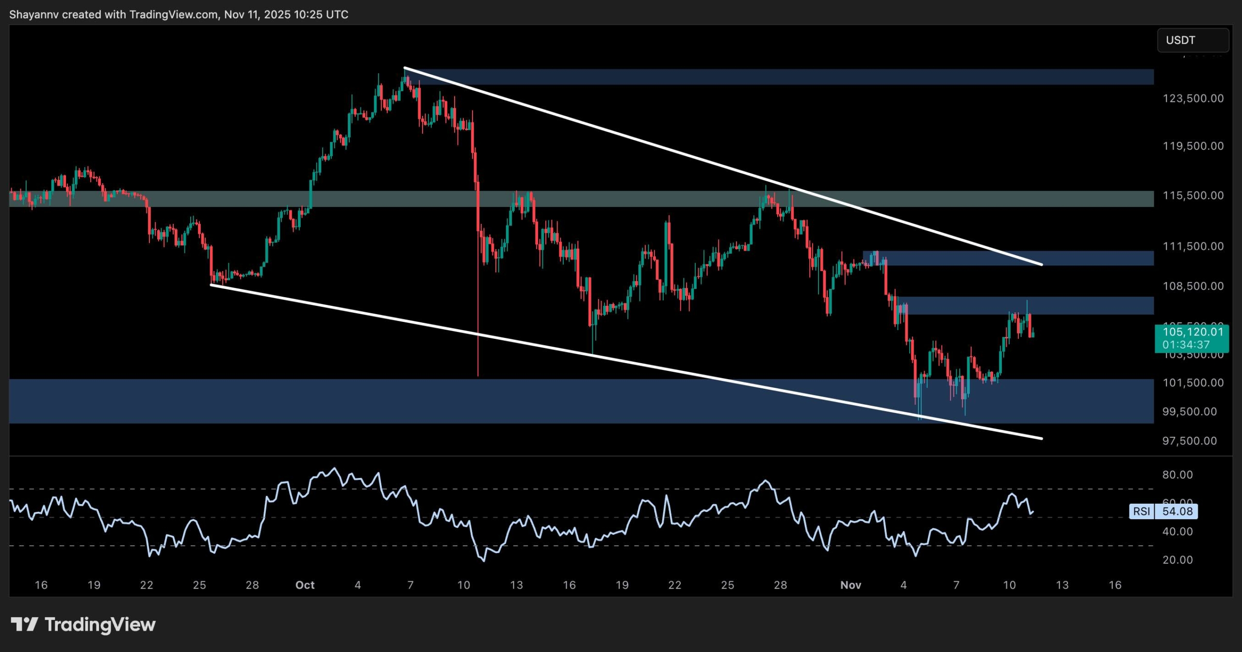 The 4-Hour structure is unfolding within a falling wedge, which BTC is attempting to break from. The price has climbed back into a short-term resistance zone near $106K after a clean reaction from the $100K demand zone.