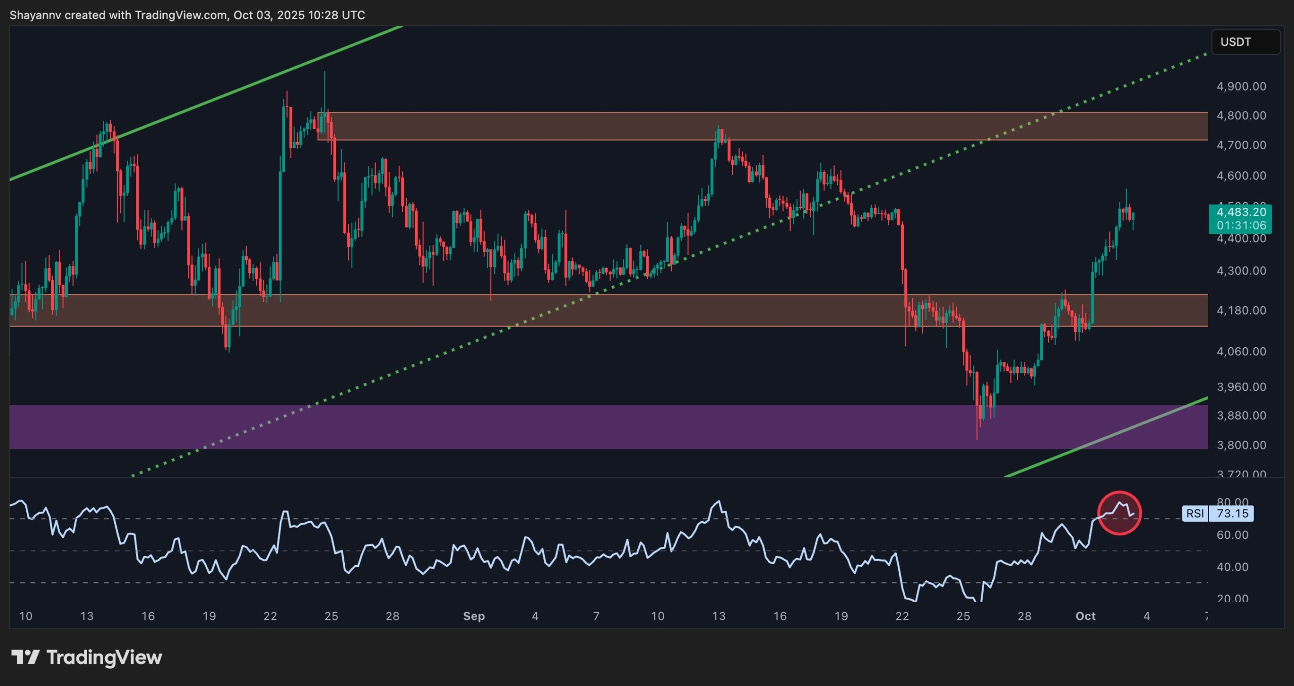 On the daily chart, ETH is trading above $4,500 inside its broader ascending channel. The asset reclaimed the $4,000 support area and pushed higher, but it’s now approaching the $4,800 resistance zone that capped previous rallies.