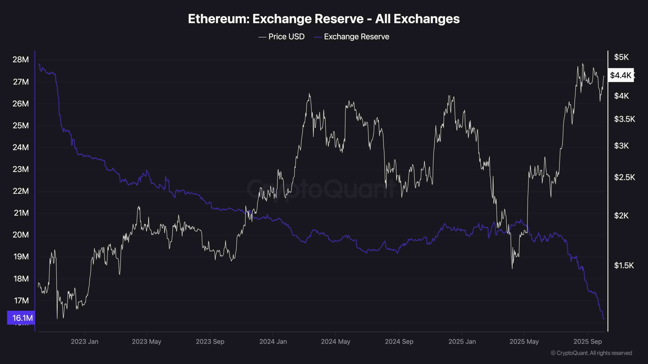 Exchange reserves for ETH have dropped to 16.1M, marking a steady multi-year decline. This indicates fewer coins are being held on exchanges, a bullish structural signal suggesting reduced selling pressure. Historically, such declines have coincided with major accumulation phases and rallies.