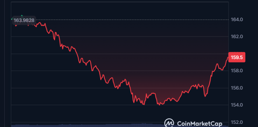 Throughout the past seven days, Solana (SOL) continues to decline. The charts are currently indicating additional downward pressure. The cryptocurrency is trading at about $158, which is 38% lower than its peak in September. Even with consistent ETF inflows, traders remain cautious as market sentiment deteriorates and liquidity changes.
